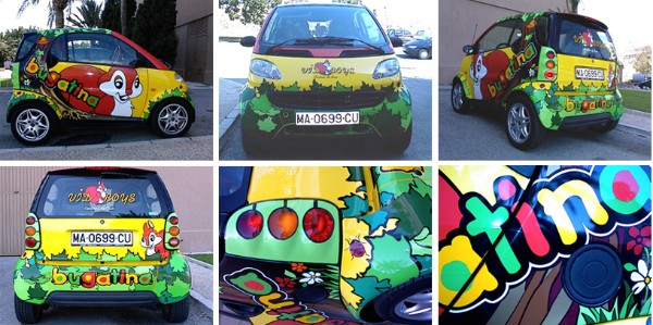 Dieser Smart ist komplett mit Hochleistungsfolie beschichtet. Die Grundfarbe des Fahrzeugs ist schwarz. Zuerst wurden die Großflächen in den verschiedenen Farben kaschiert. Danach wurden die einzelnen Applikationen übereinander verklebt. Jede Farbe, jedes Segment wurde einzeln ausgeschnitten und auf den jeweiligen Untergrund aufkaschiert.