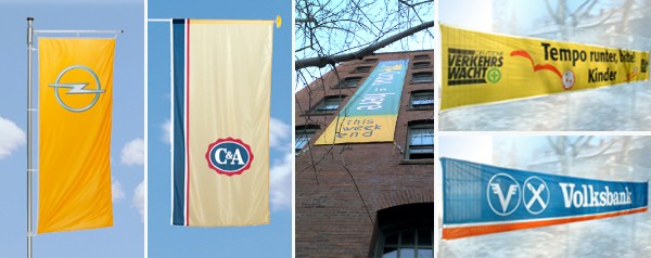 Wir hängen Ihre Werbung auf. Ob Hiss- oder Bannerfahne, Stoff- oder PVC Transparent-